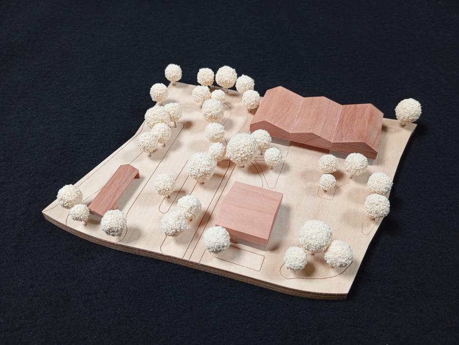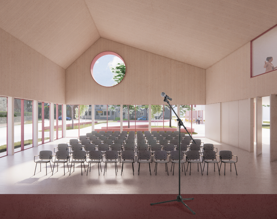 „Ein offenes Haus für alle“ organisiert das Dorfgemeinschaftshaus um ein zentrales Atrium, das sich über großzügige Glasfronten zum Platz öffnet. Jugendtreff am Fluss, Seniorentreff zur Nachbarschaft, flexibel teilbarer Bürgersaal — formelle und informelle Orte der Aneignung machen das Haus zum lebendigen Herz der Dorfmitte. Die Konstruktion folgt dem Cradle-to-Cradle-Prinzip mit einer robusten Low-Tech-Energiestrategie. „Verbindung statt Trennung“ schafft einen durchlässigen, zukunftsfähigen Stadtraum. Eine barrierefreie Fußgängerbrücke verbindet den ZOB direkt mit dem Dorfplatz, ein uferbegleitender Grünzug vernetzt bedeutende Freiräume — von der Kirchenwiese über den Hohenzollernpark bis zu den landwirtschaftlichen Stadträndern. Die Rückgewinnung wertvoller Bauteile aus dem Rückbau des „Lüdden Rathauses“ bewahrt lokale Identität und reduziert graue Energie.