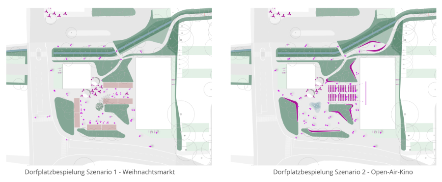 „Blaugrünes Herzstück“ macht den renaturierten Bachlauf zum prägenden Element des neuen Freiraums. Flache Uferbereiche, Überflutungswiesen und klimaangepasste Vegetationsstrukturen schaffen ökologische Resilienz und wertvolle Lebensräume für Flora und Fauna. Der neue Marktplatz wird zur lebendigen Bühne des gemeinschaftlichen Lebens — für Wochenmärkte, Kulturveranstaltungen und traditionelle Feste.